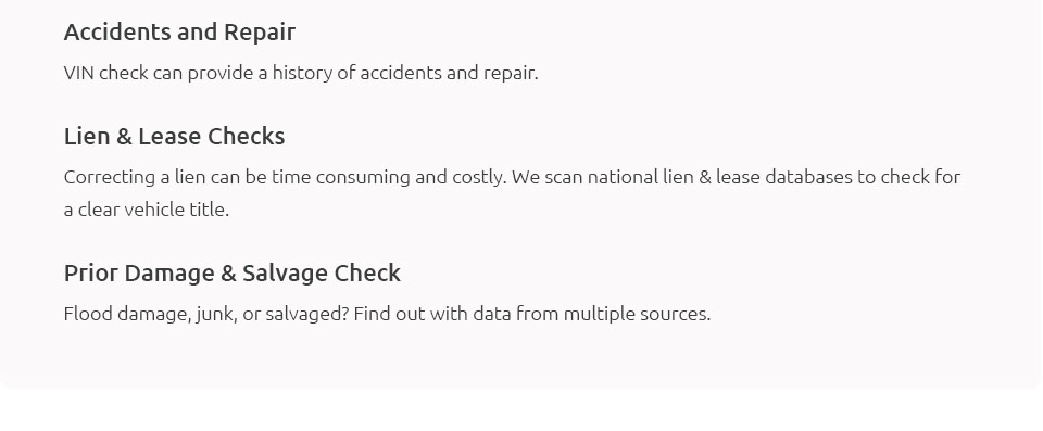 - Highlights: Online VIN lookup services; Integration with law enforcement databases; Support from insurance companies.